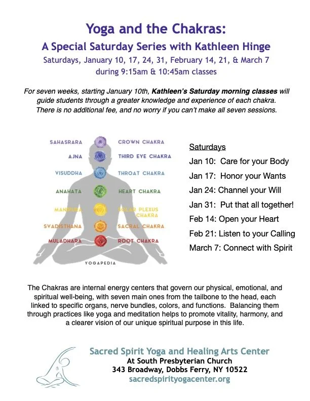 ** For seven weeks, starting January 10th, Kathleen’s Saturday morning classes will guide students through a greater knowledge and experience of each chakra. There is no additional fee, and no worry if you can’t make all seven sessions. Download flyer